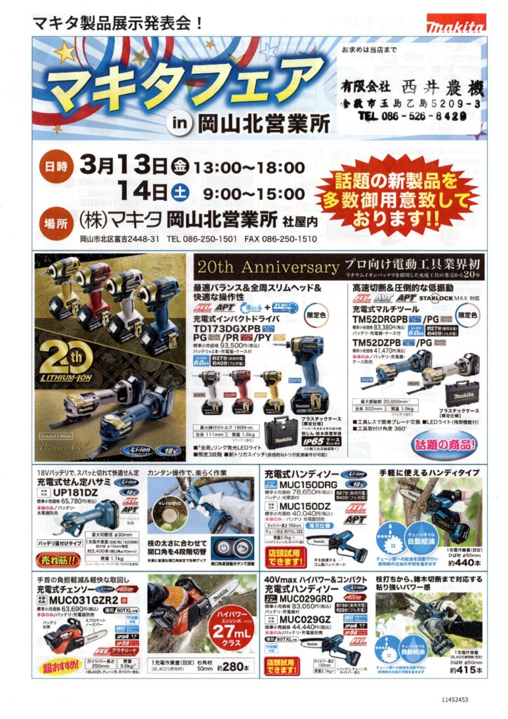 3月は岡山北営業所の展示場でマキタフェア―を開催します。